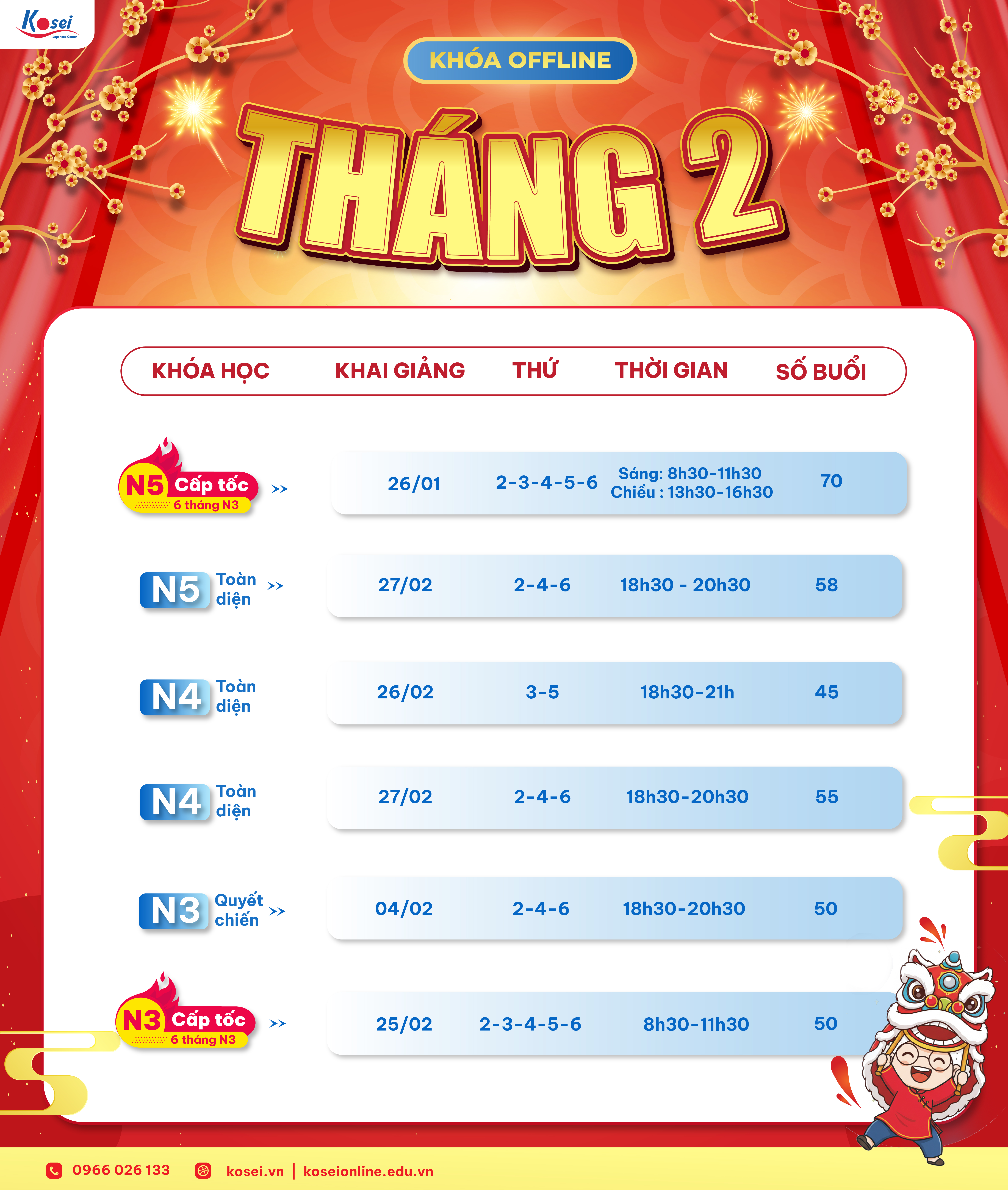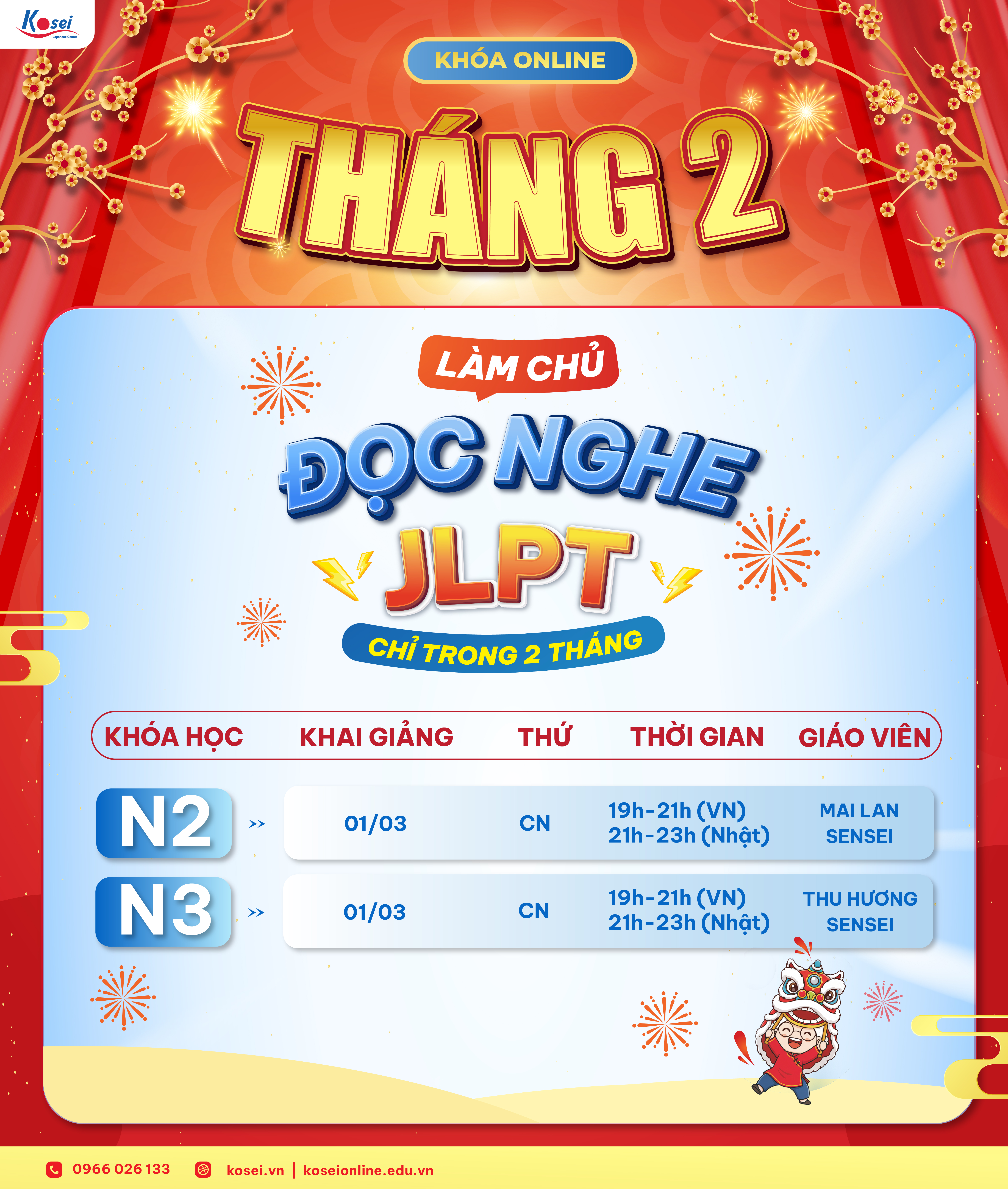 Để chuẩn bị cho kỳ thi JLPT năm 2026, các lớp tiếng Nhật từ trình độ N5-N1 đã chính thức khởi động, đa dạng từ lớp Offline, Online, App/Web. Dưới đây là thông tin chi tiết của các lớp khai giảng trong tháng 2 này tại Kosei.